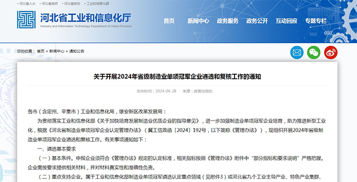 據(jù)介紹,河北省制造業(yè)單項(xiàng)冠 軍企業(yè)旨在表彰長期專注于制造業(yè)特定細(xì)分領(lǐng)域,創(chuàng)新基礎(chǔ)條件和技術(shù)創(chuàng)新能力優(yōu)異,生產(chǎn)技術(shù)或工藝水平達(dá)到國際先 進(jìn)國內(nèi)領(lǐng) 先水平,單項(xiàng)產(chǎn)品市場(chǎng)占有率位居全 球或全 國前列的企業(yè)。